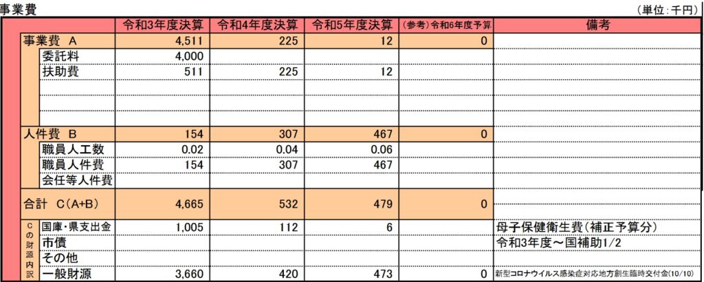 妊産婦総合対策事業費は令和2年度に開始された事業です。いわゆる「コロナ禍」において、妊婦の分娩前にPCR検査を実施、妊産婦へのケアを行う為の費用とあります。