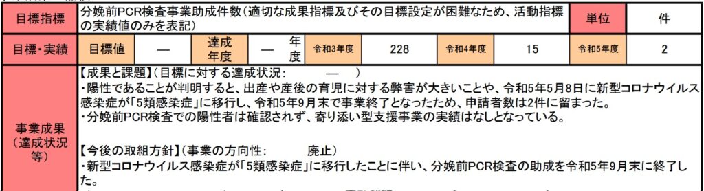 この事業の話に戻りますが、新型コロナウイルス感性症の「5類感性症」への移行をもって、事業成果では令和5年9月末に廃止したとあります。