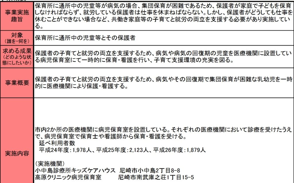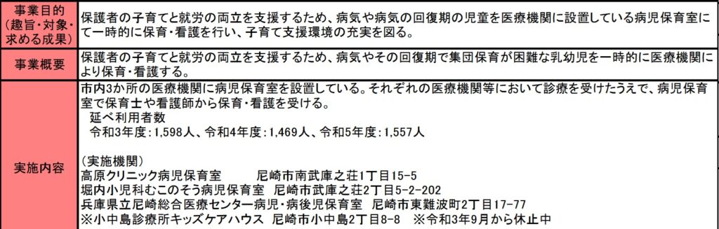 病児病後児保育事業費は平成11年度から開始された事業です。名前のとおり、病気療養中の児童や、回復中の児童を、医療機関により、保育・看護することで、保護者への子育て支援を行う事業です。