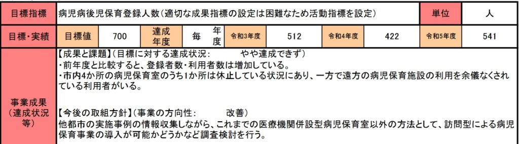 目標指標には「保育登録者数」を設定しています、これは本来「支援」を目的にした事業であることを考えれば、保育登録した児童うちで、無事に日常生活に復帰した人数を目標にするべきです。
