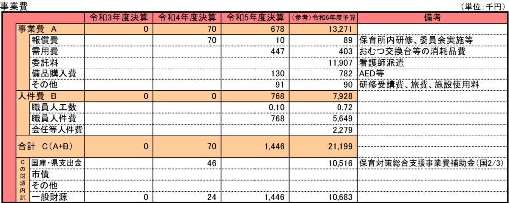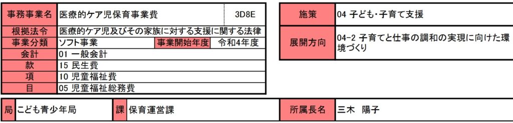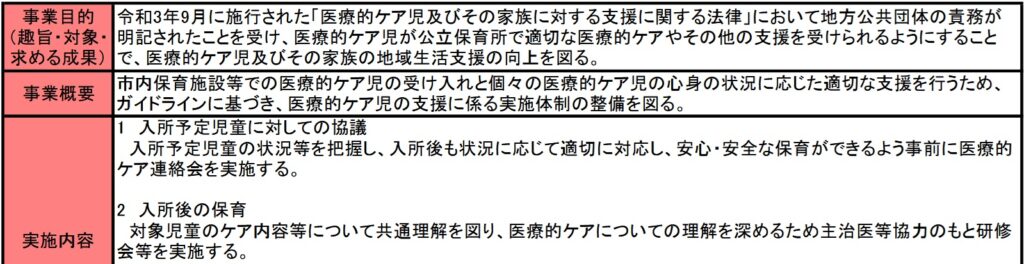 医療的ケア児保育事業費は令和4年度から開始された事業です。令和3年9月に施行された「医療的ケア児及びその家族に対する支援に関する法律」により、学校、保育所などで医療機器を用いた専門性の高いケアが必要な、学童・児童の為に、その支援体制を整備する事業です。