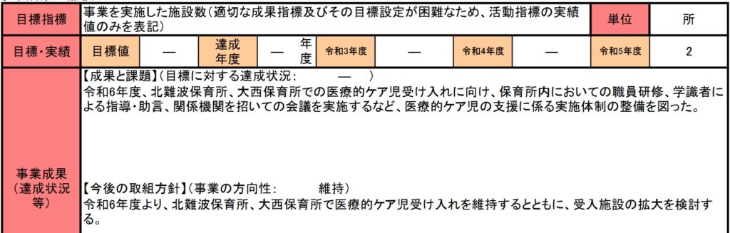 事業成果には、事業の成果とは言えない目標指標が掲載されており、尼崎市では、まだ体制整備と関係者間の検討の段階であることが伺えます。