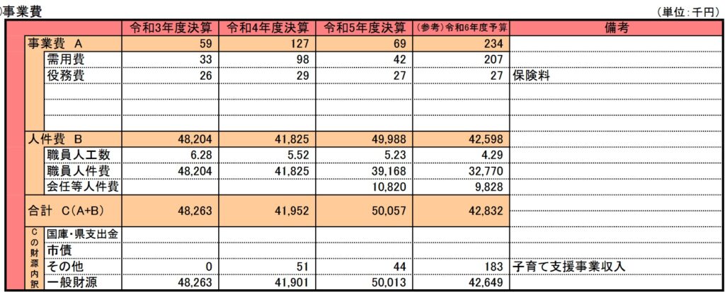 次に事業費を、効果されている平成27年度と、今回の令和6年度で比較すると、事業費全体は平成27年度の半分以下に下がっていました。さすがに少子化で事業費は半分に減ったのかと、考えましたが、コロナ禍で休止しているイベントもあるようで、今後はまた依然と同様の事業費に戻したいが為に、この事業を継続しているのではないかと、邪推してしまいます。