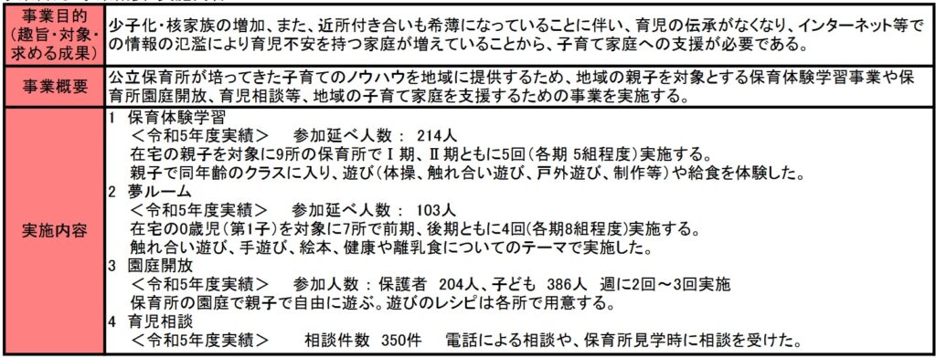 この事業の実施内容を見ると、子育て家庭への支援と称していますが、実際はただの保育所でのイベント開催が中心です。一つ例を挙げれば、「保育体験学習」では、親子での保育所に招待して、保育所を体験させています。対象は各保育所5組まで、時間は9時45分~正午までの限定的なものです。