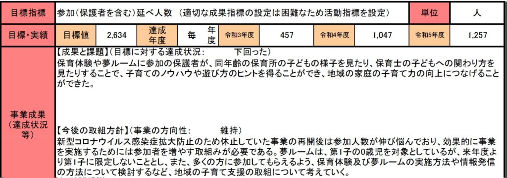 さらに、事業成果を見ていくと、目標指標にはイベント参加人数(保護者を含めて)の記載があり、令和5年度ではこの目標指標が、半分も達成できていないことが書かれています。