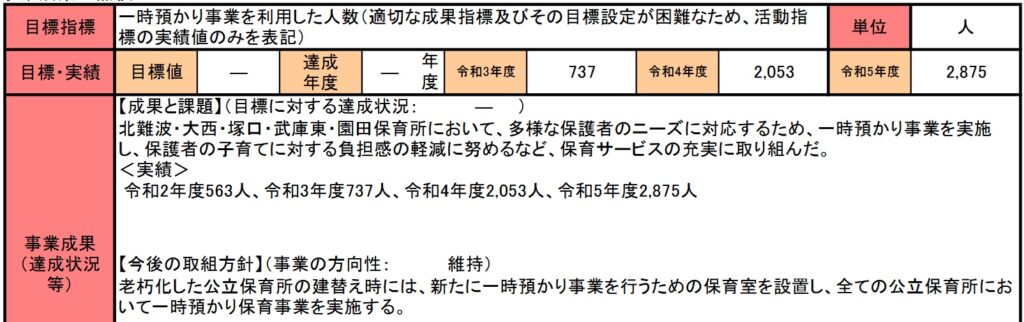 事業成果には、令和2年度から令和5年度まで、一時預かり利用者の数自体は増加していることが書かれています。