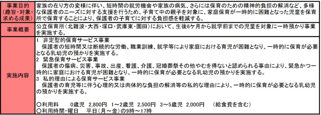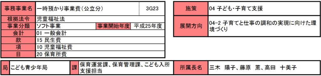一時預かり事業費(公立分)は平成25年度から開始された事業で、名前のとおり、就学前の子どもを一時的に保育所で預かる事業であり、(公立分)と記載があるように民間で実施している一時預かりサービスにも、別の事業費が使われています。