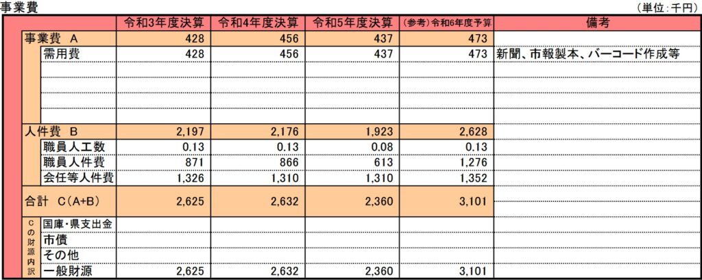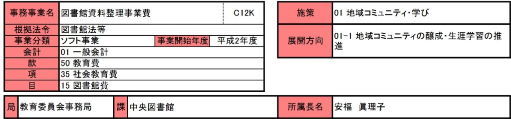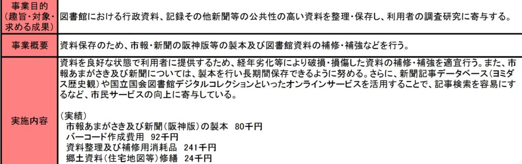 今回も図書館関連の事業で図書館資料整理事業費になります。図書館関連の事業はこれで最後になります。この事業は平成2年度から開始されており、事業目的には『公共性の高い資料を整理・保存し、利用者の調査研究に寄与する。』とあります。ただしこの事業でも電子化の意思は確認できず、後述しますがせっかく修繕した資料や製本した古い新聞資料も中央図書館に足を運ばなければ閲覧できないようで、市民の公共財産として広く公開するようすはありません。