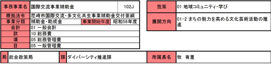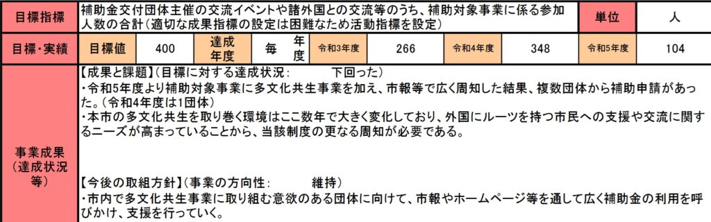 今回は国際交流事業補助金です。今回から施策01のなかの〈まちの魅力を高める文化芸術活動の推進〉に分類される事業です。この事業は昭和56年度から実施されているのですが、後述する事業目標の目標値に届かない結果でありました。40年以上継続してその結果であるならば大幅な見直しや廃止を含めた検討を行うべきと思いますが、残念ながらこの事業も継続となっております。
