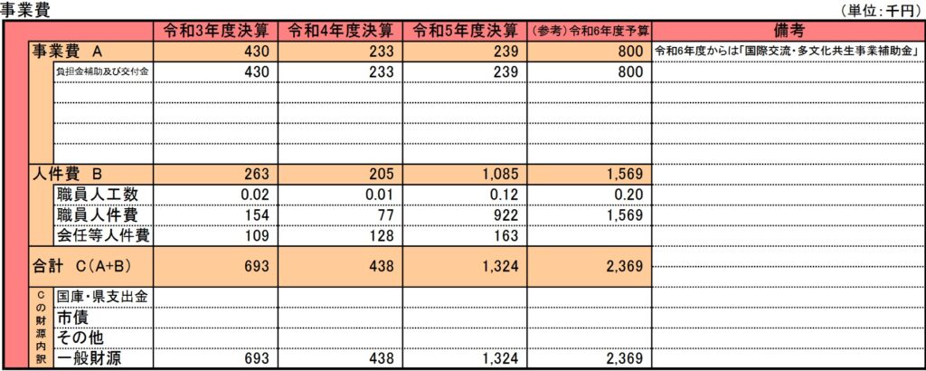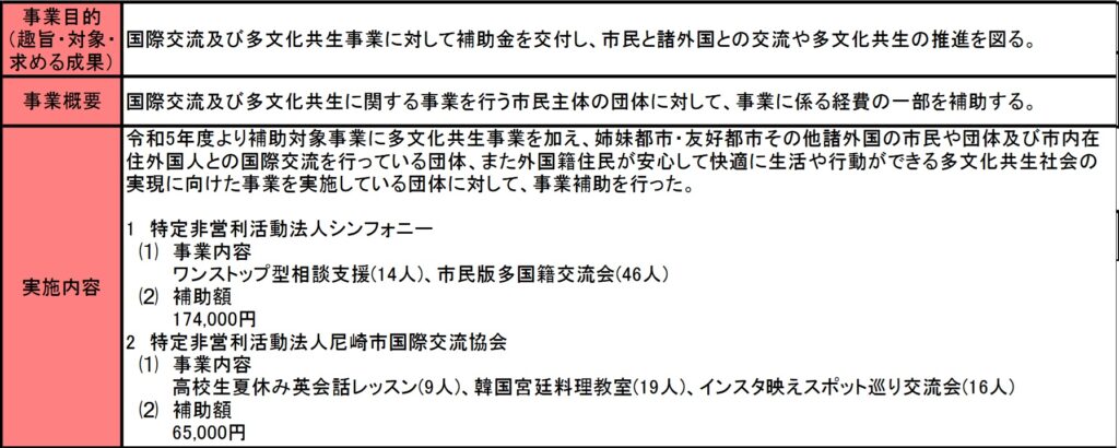 事業目的は諸外国との文化交流や多文化共生の推進を図るとあります。目的としては否定しませんが、その事業内容を見るとNPO法人に委託してイベントを行っただけの内容です。