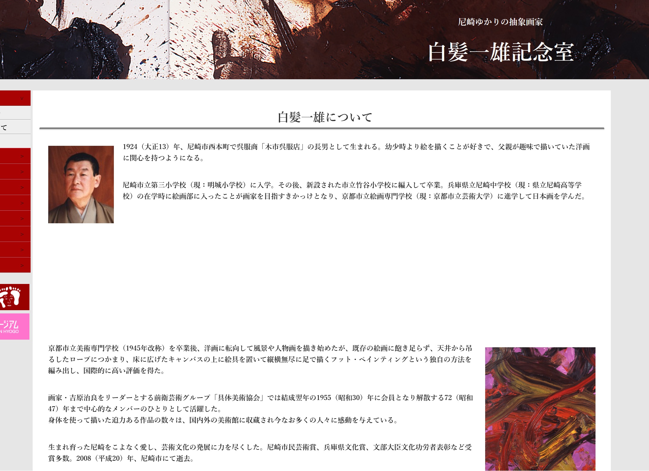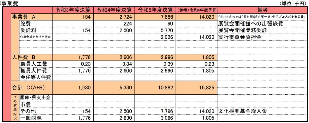 今回は白髪一雄生誕100年記念事業費です。令和元年からの事業で尼崎市出身の画家『白髪一雄』の生誕100年を記念にして行われた事業です。令和6年度に丁度生誕100年を迎えることから令和元年から国内外に向けて広報活動を行ってきた事業のようです。白髪一雄についてはリンク参照ください。