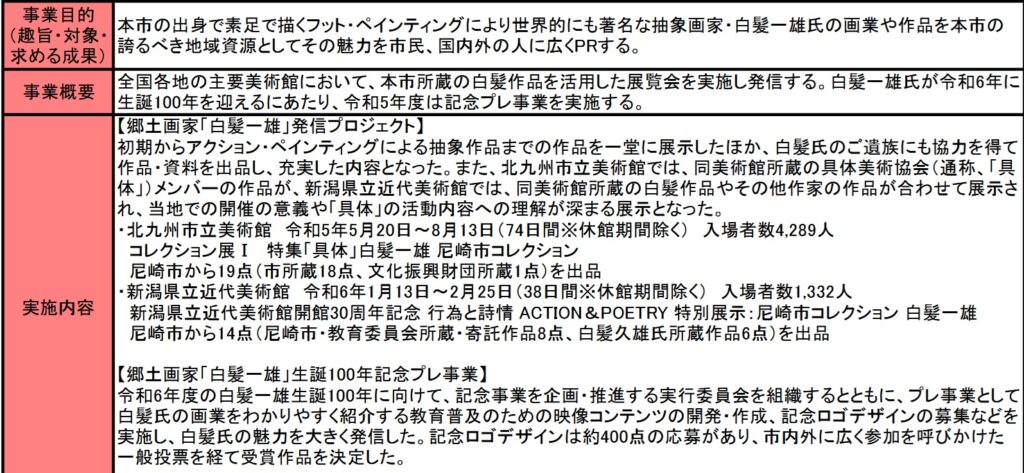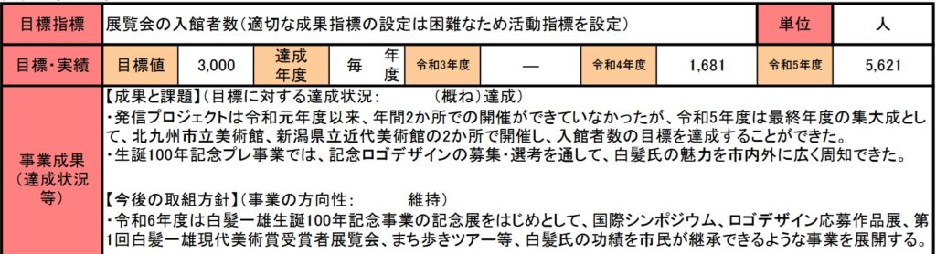 先ほど記載したとおり、この事業の目標数はあくまで尼崎市が行ったイベントの入場者数であるべきです。なぜなら他の自治体(今回は九州と新潟)での『白髪一雄』の知名度が向上しても、肝心の尼崎市内での知名度が上がらなければ、市内から第二第三の『白髪一雄』を目指す人たちが現れる確率は高まらないと思います。(現に筆者も『白髪一雄』の名前は今回の投稿をきっかけに知りました)
