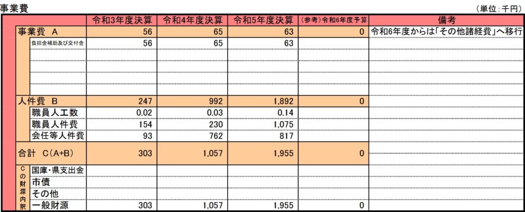 事業費では令和6年度からはその他諸経費へ移行とあり、今後見ていく施策の後半に経費が記載されているのだと思います。市の中でもこの事業を重要視していないのが表れています。そして今回も交付金額より高い人件費を使っています。この表記からでもやはりはじめから税金を取らずにおいたほうがいい事例の典型のような事業です。