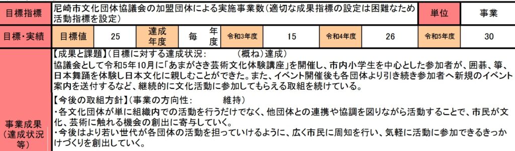 この事業でも上述したように『適切な成果指標の設定は困難』とあり、各団体が行った活動やイベントにおける市民の参加人数や成果を記載することもしていません。達成状況等には『気楽に活動に参加~』とあります。ならその為の施策を市として打ち出すべきです。これは尼崎市自身が実施した令和4年度の調査でも出ていることです。文化に関する市民意識調査 結果の中の文化鑑賞・体験、活動しなかった理由の1位は『時間的余裕がない』であり、これは平成28年度の調査でもおなじです。また同じ調査結果の中では鑑賞・体験、活動のための改善希望が聞かれており、改善希望の1位は『お金を多く使わなくても楽しむことができるプログラムの拡充』とあり、金銭的な余裕も時間もないことが原因であると市の調査結果からも証明されています。であれば市として事業努力すべきはこの金と時間がない市民が多い状況の解消ではないでしょか。貧乏暇なしです。
