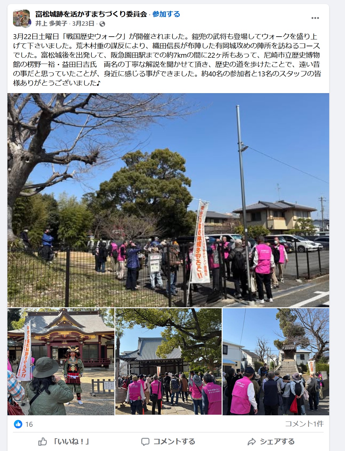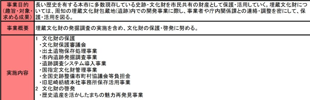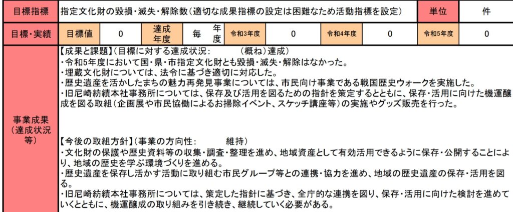 事業の目標指標ですが当然今回も『適切な成果指標が困難~』との記載がありましたが、それは確かに毎年どのような文化財が新たに加わるのかを調べるのことは困難なことからも理解できます。そして歴史資料等の公開は尼崎市歴史資料館がホームページ上で尼崎市歴史資料館デジタルアーカイブのページで資料公開が実施されていることから今後も継続していくべき事業とは思います。ただし、市民向け事業で戦国歴史ウォークを実施して、しかも参加者40名程度でほぼ老人ばかり、こんな事業まで継続するのは支持できません。詳細リンク下記参照