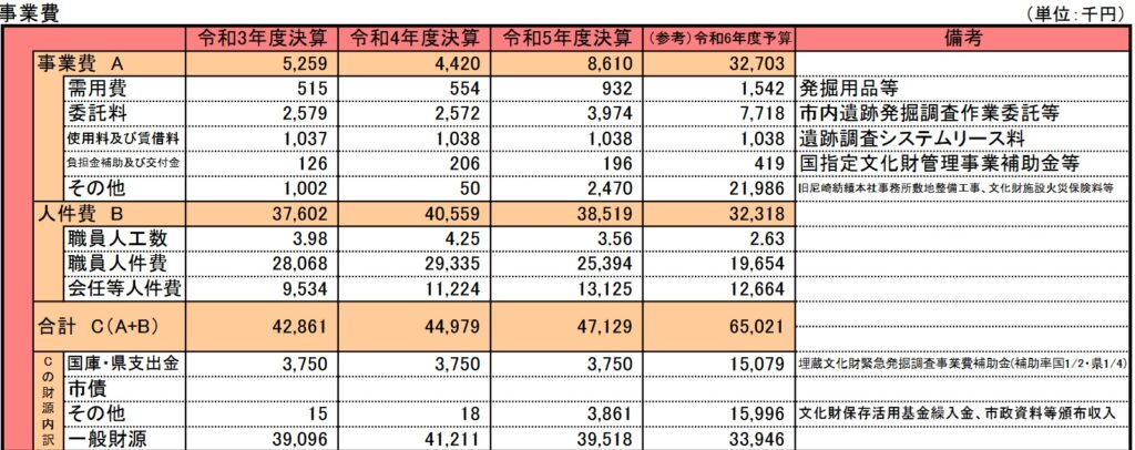 この事業の事業費ですが先ほども記載した通り記念館の調査費用等もこの事業費用に含まれており、尼崎市が作成した旧尼崎紡績本社事務所(前ユニチカ記念館) 保存・活用に関する指針を確認すると、本格的な活用は令和9年度以降を予定しているとのことです。この記念館は令和2年度に所有者であったユニチカが解体を検討し始め、尼崎市が寄贈という形で取得したものです。令和2年から時間があって何を検討していたのでしょうか?また補修費用には数億円がかかると資料のなかでも認めており、ユニチカから2億円2千万円の寄付を受けたともありました。正直解体費用がそれ以上かかったと思われるのでユニチカからしたら尼崎市の申し出はありがたかったのではないかと思われます。この尼崎市の資料を確認する限り明確な活用方法を決めてから実施された事業ではないのではないかとの疑問をもたずにはおれませんが、今後の事務事業評価で確認していきたいと思います。