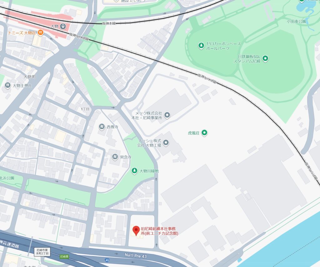 下記は旧尼崎紡績本社事務所(前ユニチカ記念館)の立地場所です。近隣に阪神タイガースの2軍施設や大物主神社・大物川緑地もあり、開発によっては観光資源としての活用も見込めるかも知れません。