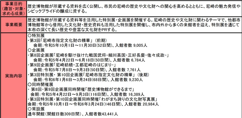 事業目的にある魅力発信・シビックプライド(郷土愛)の醸成をどのように行っていくのかと内容をみると、企画展示会を開催して尼崎市内外から来館者を呼び込んだとあります。後述しますがその来館者も目標の5万人(年間)には届かず、市外の来館者数や市内の来館者数を比較した資料なども尼崎市のホームページにはありませんでした。(2025年8月26日現在)