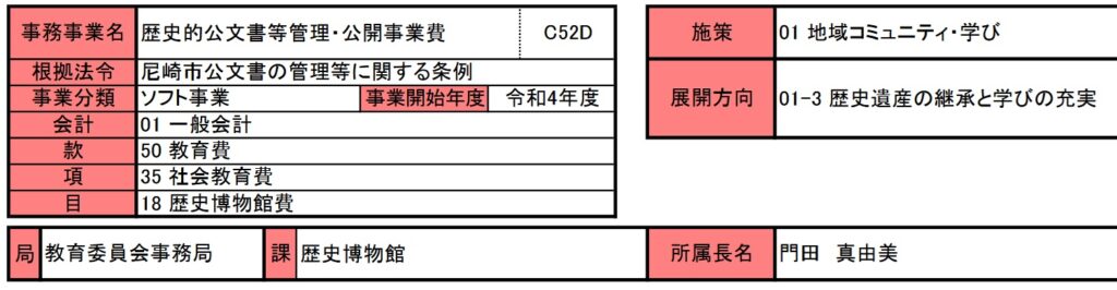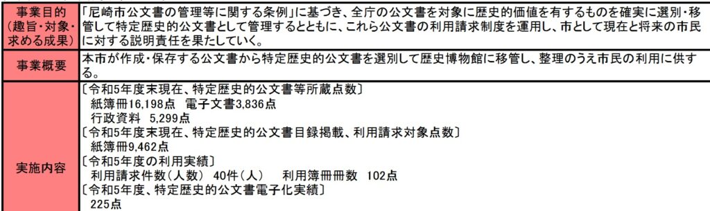 そのうちこの特定歴史公文書等という文書の管理についての事業と思われますが、内容を見てもあまり進んではいないようです。当然ながら古い資料が多く、紙の劣化や分類分けも正確でない場合もあるでしょう。いっそうのこと外注に頼んでもいいのではと思います。現役の役所職員の方々がされているとすれば彼らの業務時間を圧迫しているだけなのでは思います。この事業自体の意味については後世研究者と尼崎市民が享受するためのものであり、現在の我々には何ら益のないものではありますが、ただ現在の役所仕事が未来の市民や研究者に裁かれるためにもこのような事業は正確に継続されるべきでしょう。