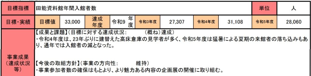 事業開始して50年以上が経過しており、史跡事態の調査・発掘はすでに完了しているとは思います。事業目標指標を見ても年間目標数は33,000人とあり、尼崎市歴史資料館が掲げた目標年間50,000人を下回る数を設定していることからも尼崎市でも今後多くの来館者を期待できる状況ではないと認識していると思われます。