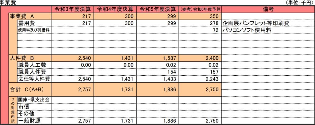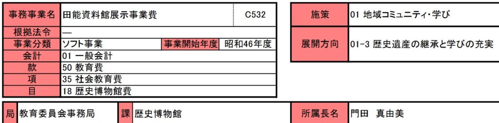 今回も博物館関係です。尼崎市歴史博物館が完成する以前に建てられていた田能資料館(以下、資料館)、今回はこの資料館についての田能資料館展示事業費です。国史跡に指定されている資料館で昭和46年度からの事業になります。50年以上事業を継続している資料館であることと尼崎市歴史博物館が完成したことからも、今後は閉館を含めて改革が必要な事業ではないかと思います。