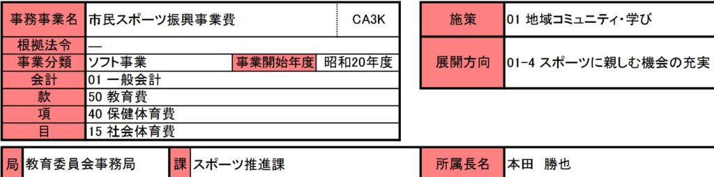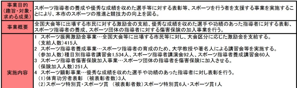 今回もスポーツ関連で、昭和20年度から実施されている市民スポーツ振興事業費です。この事業費は今までような市民の健康増進を目的にしたものではなく、純粋にスポーツの競技力に焦点を当て、競技成績の上位者を称えることと競技レベルの向上を目的とした事業です。事業目的自体は理解できますが、事務事業評価の内容としてしてはまだ不十分と思われる個所がありましたの見ていきましょう。