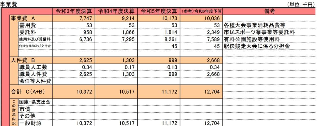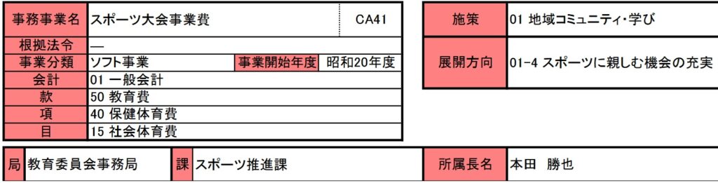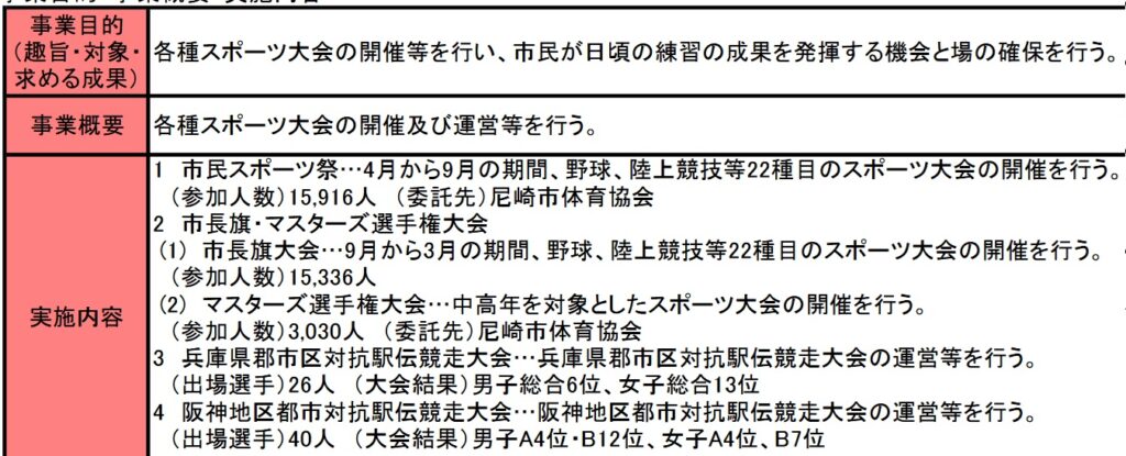 今回もスポーツ関連事業で、スポーツ大会事業費です。昭和20年度からの事業で尼崎市市民スポーツ祭やマスターズ選手権を行うための事業費になります。この事業も開始から80年経過した事業であり内容や規模を含めて根本的な見直しはするべきでしょう。