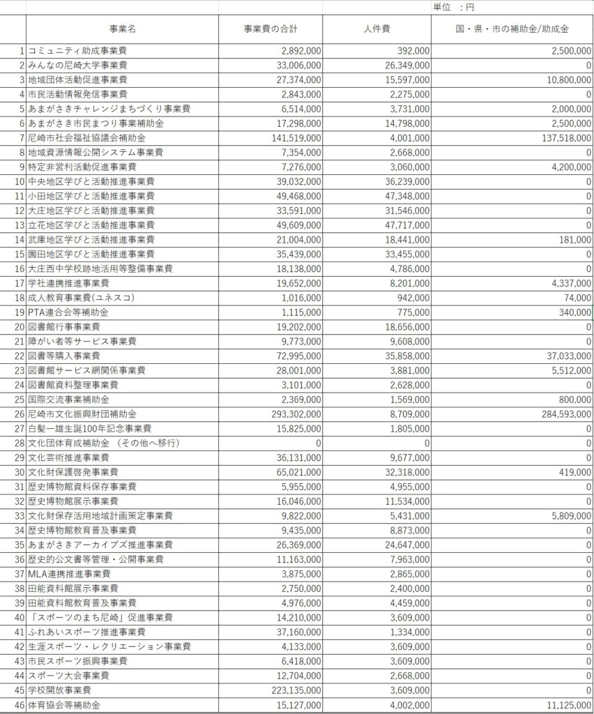 今回は施策01【地域コミュニティ・学び】の事務事業評価のまとめしていきます。まとめ方としては全事業費の総額から人件費・人件費以外の費用・国や市・県からの補助金/助成金の3種類を調べました。