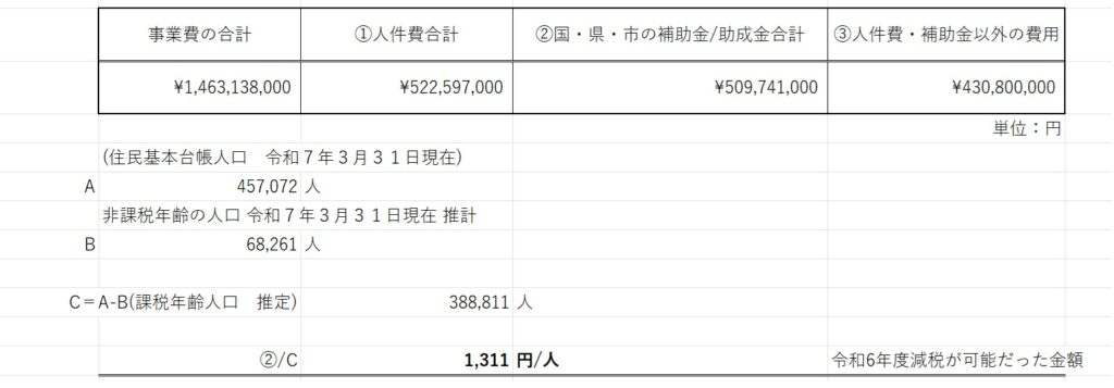 この約5億円の補助金/助成金の合計を尼崎市の人口(18歳以下を省く)で割って一人当たりで計算すると¥1,311円となります。