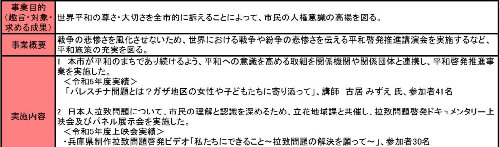 事業内容では北朝鮮民主主義人民共和国による日本国民の拉致問題を取り上げており、この点は評価できる内容と思います。ただしパレスチナとイスラエルの問題は歴史的な背景や宗教問題によって見解が分かれる意見も多く、安易に市の事業として行っていいものではないと考えます。もし行うのであれば事実としてパレスチナ側からのテロ活動やそれらを支える彼らの宗教観などを伝えて、両論併記を行っていくべきではないでしょうか。