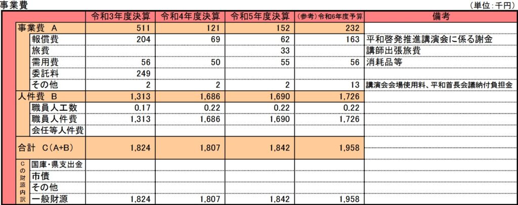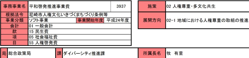 今回も人権関連で、平和啓発推進事業費です。平成24年度から実施されており、よく聞く平和の尊さを市民に啓発してやるという、役所や活動家からの上から目線がよく表れている事業です。せめてこの事業を平和の啓発というのなら日本における平和を維持するためには誰が、どこで、どのように実務に携わっているのかも含めて市民に啓発して頂ければと思います。