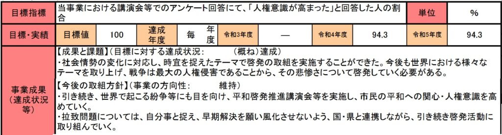 この事業成果では人権意識の高まりをアンケートの結果だけで判断しており、しかしそのアンケートの集計人数も参加人数100名以下のものをもとにしています。このような評価方法では適切に評価できるわけがありません。せめて1000人~2000人の参加者を集めるなど真面目に啓発活動を行っていくべきです。(そうするとさらに税金を投入する理由を見つけ出すのでしょうが・・・)