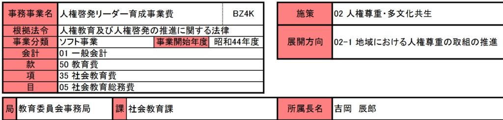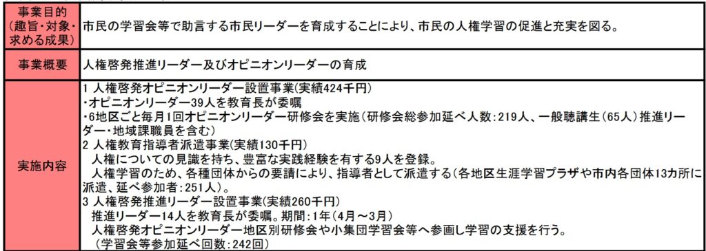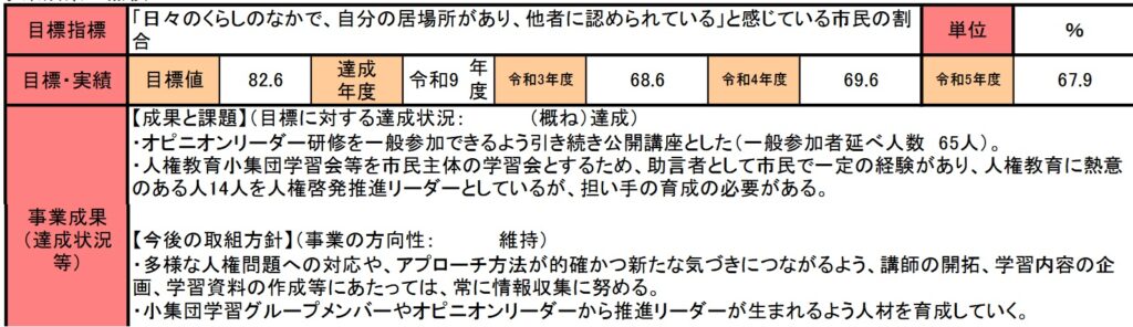 この事業では育成されて市民リーダーの実務事績や具体的に人権啓発に役立った事例等も記載されておらず、まったくこの事業内容にとっては意味がないとおもわれる市民のアンケート結果を目標指標にしています。市民リーダーを育てるのが目的なのになぜその育てたリーダーの数すら記載されていないのでしょうか?。このことからも、(事業の有効性は別として)本気でこの事業に取り組む意思すら感じられません。