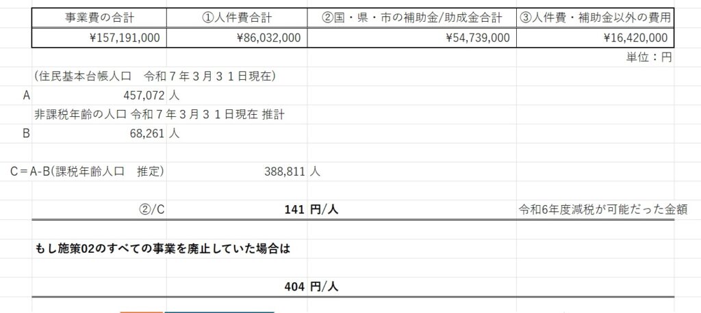 まとめ方施策01の時と同様に、全事業費の総額から人件費・人件費以外の費用・国や市・県からの補助金/助成金の3種類を調べ、それぞれの割合を調べています。そのうち補助金/助成金は国や県・市がバラまいた税金であり、本来であれば国民が支払わなくてよかったはずの税金という考えで、減税が可能であったはずの金額を計算しています。