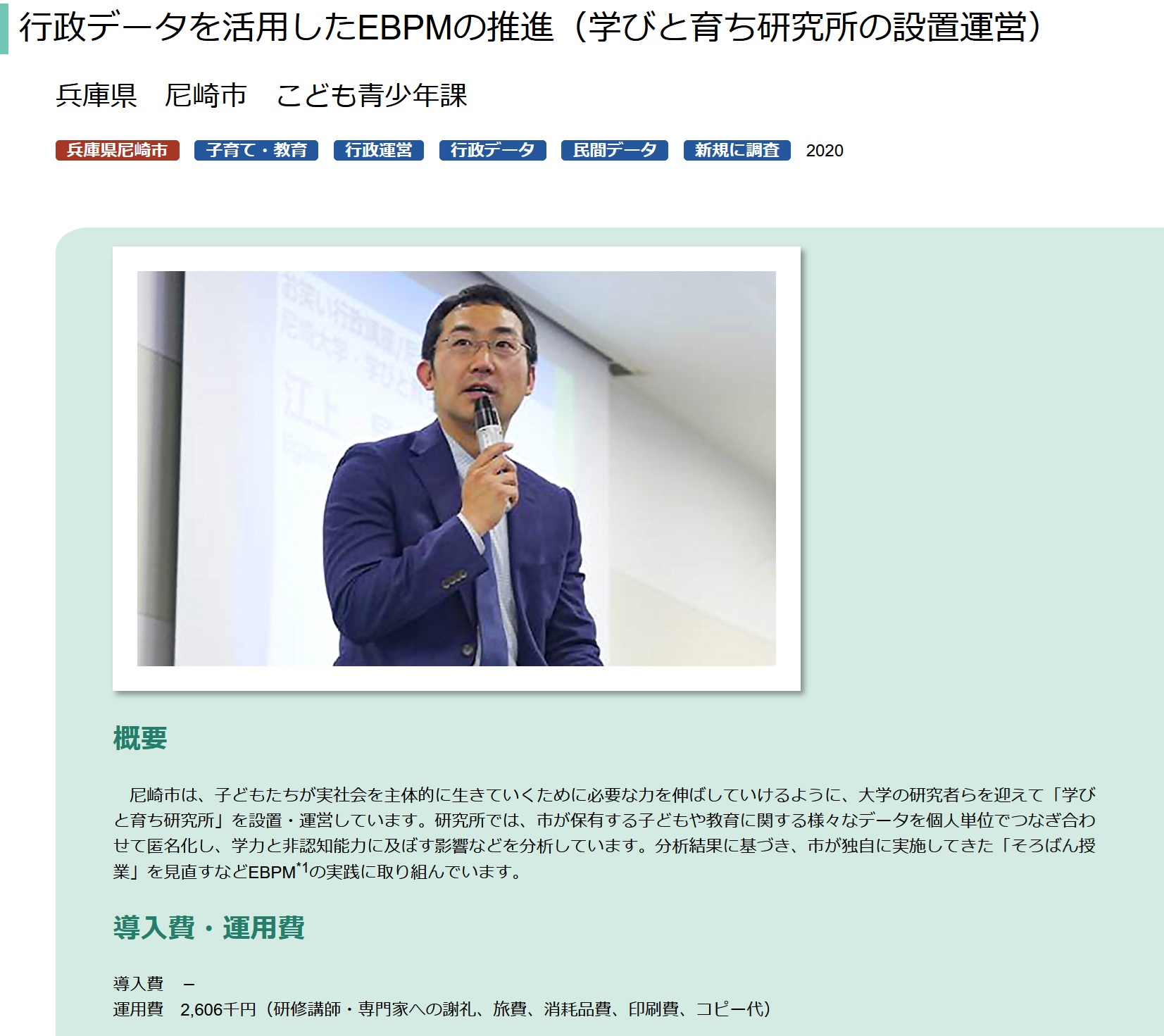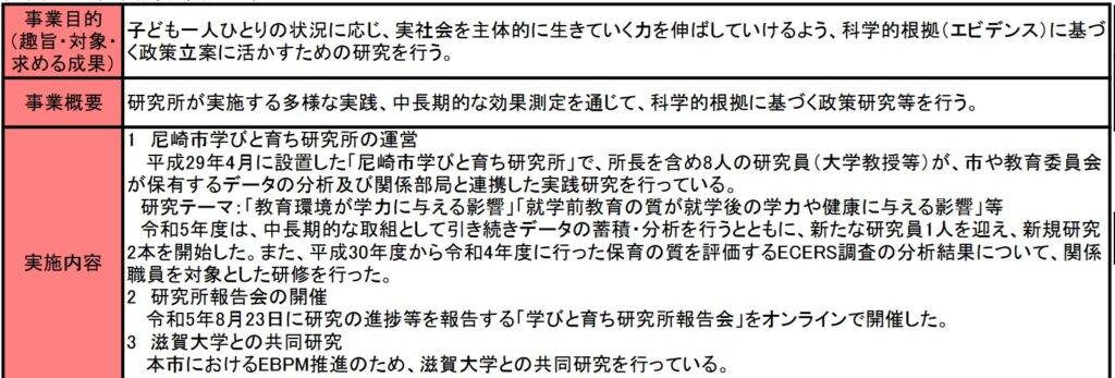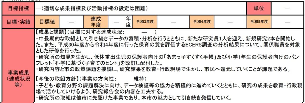 この事業の事業目標指標には当然のことながら指標の設定は困難とあり、その事業成果の内容からは前項で指摘したとおり市としても政策課題と接続して、得られた研究成果を現場に反映することには課題と認識しているようです。ただしこの事業としては先進的な取り組みのようで市としても今後も継続するとしています。