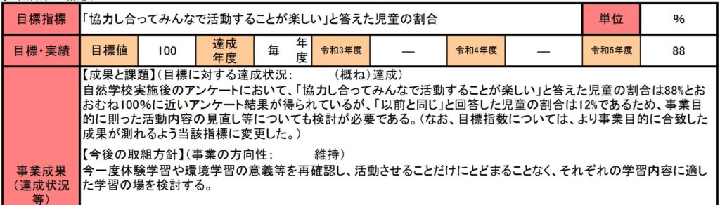 この事業の指標は参加した子供たちの感想を使用していることです。確かにめったにない体験ができて子供たちは楽しいでしょう。また来たいという子供もいるでしょう。でも大人は違うはずです。せめて子供たちのその後の生活態度や言動を観察して、今度の体験学習の改善や見直しを行っていくことが勤めのハズです。安易に子供の感想を指標にして、もっと事業費の拡大を・税金をと訴える根拠にすることは恥すべき行為です。