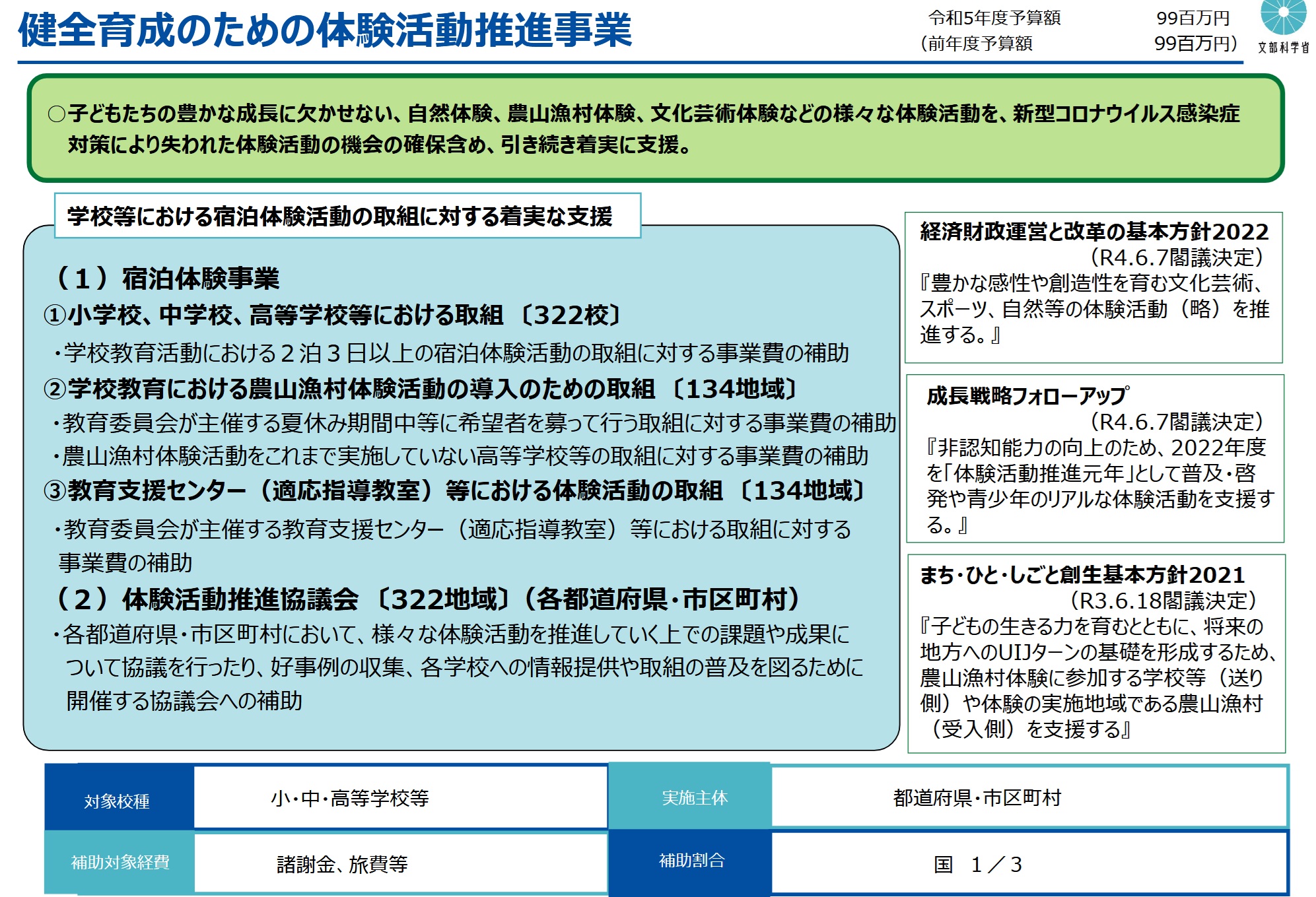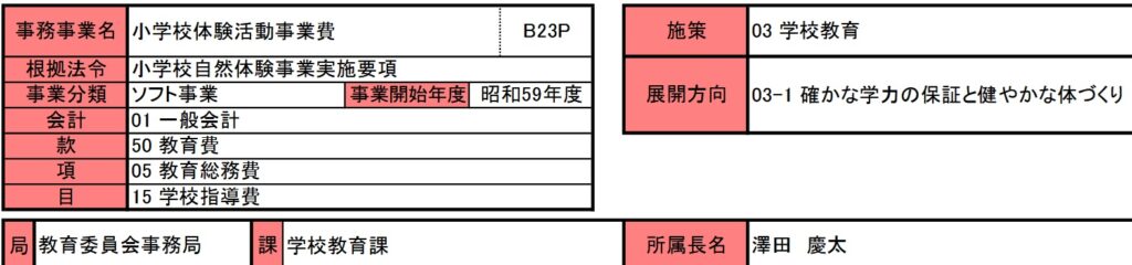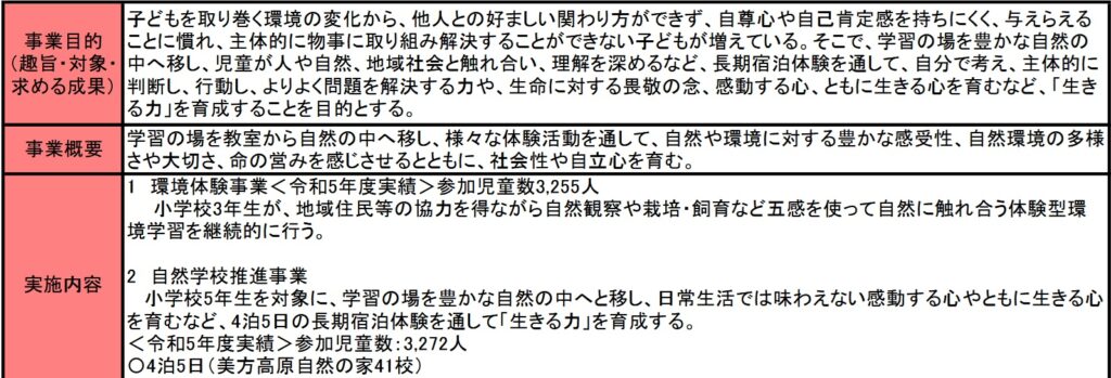 今回投稿するのは小学校体験活動事業費です。昭和59年度から実施されており、冒頭に掲載したとおり、文部科学省からの補助金交付を受けて実施されています。目的は子供たちに自然の中での体験をしてもらい「生きる力」を育成するとあります。著者も数十年前に聞きました「生きる力」。この「生きる力」の定義をいまだに聞いたことがありません。何をもって・何を経験して・何を体験して「生きる力」とするのでしょうか?これも定義が、つまり目的があいまいな教育関連事業のもっともたる事業と思います。
