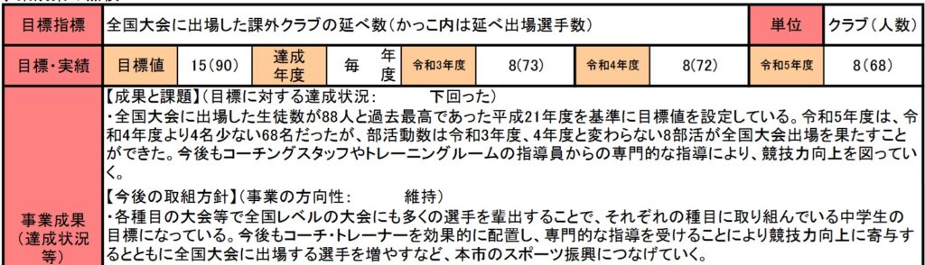 それであれば初めから生徒の体力・運動能力の向上などど言わずに、素直に全国大会出場者数を増加させて市の地名度向上を狙うぞ と言ってほしいです。