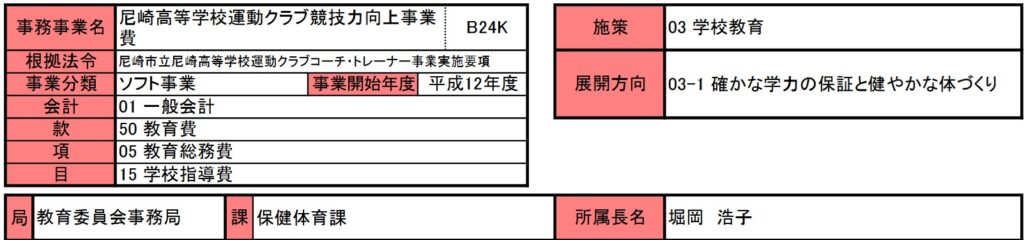 それでは今回は尼崎高等学校運動クラブ競技力向上事業費を取り上げます。平成12年度からの事業で尼崎市内の高校生を対象にして、コーチングスタッフを配置・招へいすることで競技力向上を図るとあります。このコーチングスタッフですが以前取り上げた体育協会等補助金にて補助金交付を受けている