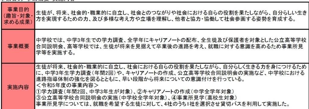 なぜキャリア教育という名前にしたか疑問です。普通に進路教育とか学力調査事業とかでよかったと思いますが、事業の内容も無理に学力調査と進路教育を混ぜた内容になっています。