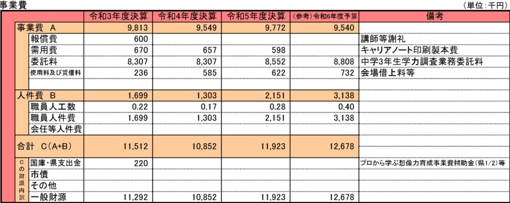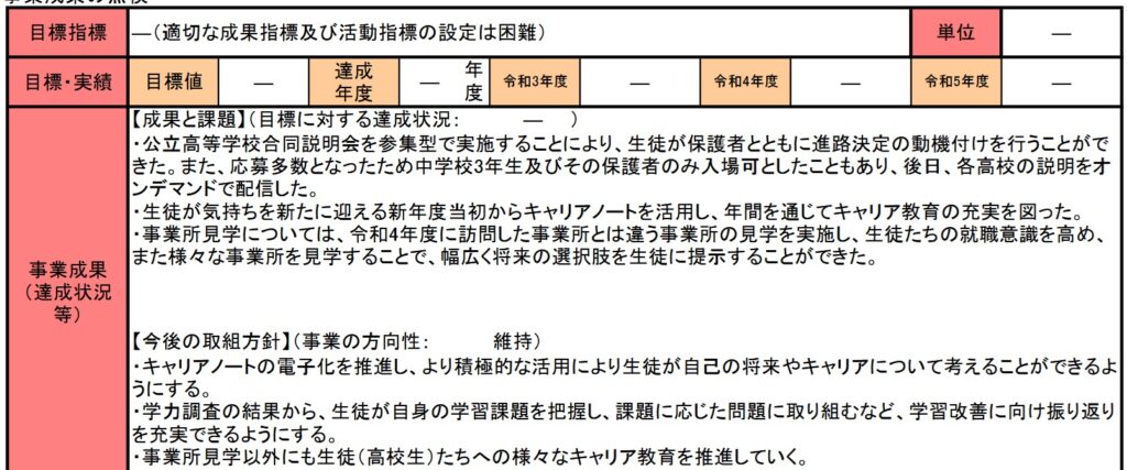 この事業の書かれている目的は前項に掲載した尼崎市の教育行政において目指すべき人物像にも合致したものであると思います。しかし肝心の事業内容は中学3年生を対象にした学力調査や全学年にキャリアノートを配布しましたとあります。
