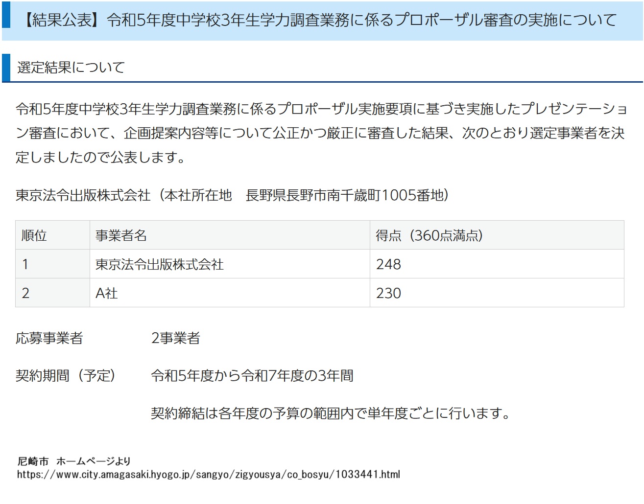 この事業の事業費を見ると年々増加しており、そのほとんどは学力調査業務委託料です。ちなみに令和5年度にはアイキャッチで掲載した東京法令出版株式会社という会社に委託されているようです。ちなみにこの会社ですがJUDGITの東京法令出版に対する政府支出金額を見ると中央官庁からも出版物の仕事を請け負っている会社のようです。この資料からは天下り先への利益誘導とは言い切れませんが、