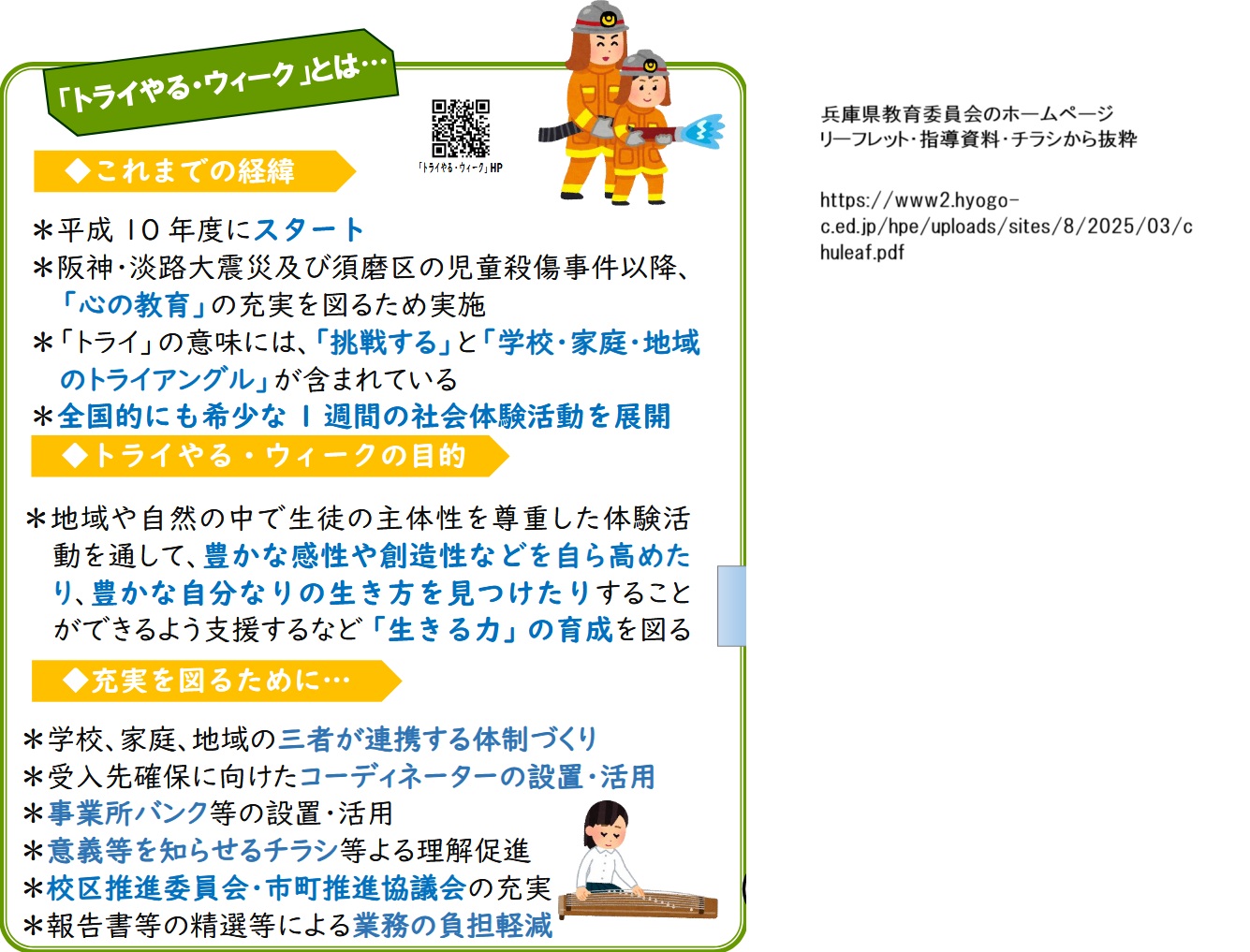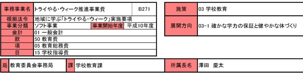 今回はトライやる・ウィーク推進事業費です。平成10年度から実施されておりこの事業自体は兵庫県教育委員会が実施する事業「地域に学ぶトライやる・ウィーク」の下請け事業であり、兵庫県教育委員会の資料を見るかぎりでは一定の効果があったことが資料として作成されています。「トライやる・ウィーク」10年目の評価検証