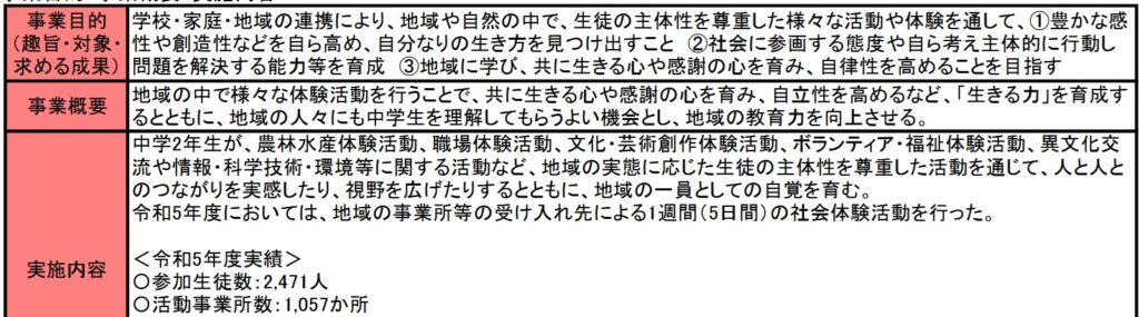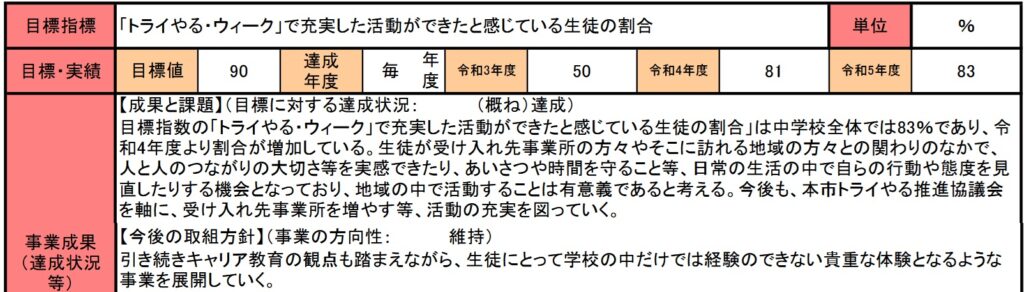 事業に対する「意思」が感じられないのはこの事業の目標指標にも表れています。「トライやる・ウィーク」に参加した生徒たちからのアンケート結果を集計したようですが、単純に「充実した」と感じたか、否かのみを指標にしていました。せめてそこからさらに分析を加えて、どのような体験で生徒が「充実した」と感じる傾向が多かったかや、職場毎に違いがあるのかなどの集計を加えることもできるはずです。または本当に子供たちの人生の選択に役立ったを調査するためにも、高校3年生の際に再度アンケートを集計して分析するなどを市としても独自に行える工夫はあるはずです。