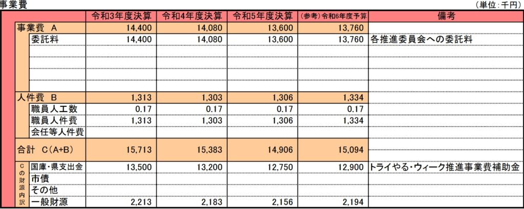 この事業の事業費を見ると各(トライやる・ウィーク)推進委員会への委託料を、県からの補助金で賄っていることがわかります。この推進委員会の詳細については尼崎市のホームページでは掲載がなかったのですが、代わりに尼崎市中央中学校トライやる・ウィークという資料を見ると、中学2年生の保護者で組織された委員会のようです。