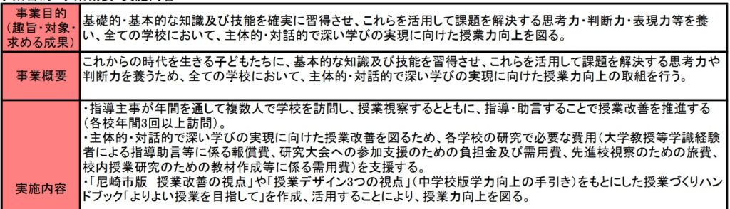 この事業、以前投稿した学びと育ち研究所運営事業費との関わりは記載されておりません。教員への事業内容だからでしょうか。実施内容には指導主事という方が年間数回だけ授業を視察して、指導・改善をするとあります。著者自身は教員経験はありませんが、授業は生徒と教員の人間関係に基づいたものが存在するでしょう。それを年数回しか視察にこない人間が、適切に指導・助言できるとは思えません。事業費にはこの事業のほとんどの予算は先進地視察旅行費と授業改善推進委員会への委託金になっていました。