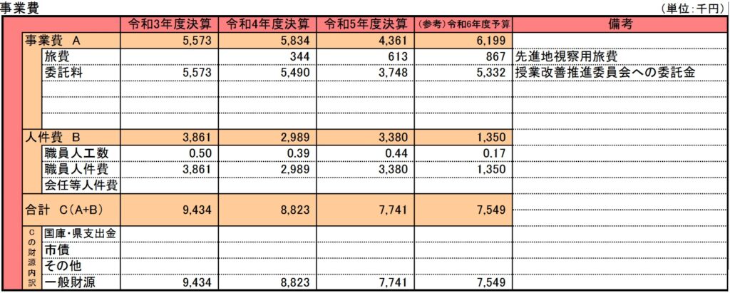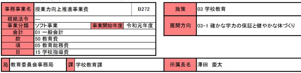 今回も教育関連事業です。令和元年度からと比較的新しい事業である授業力向上推進事業費です。生徒の為というよりは、生徒を指導する側である教員の方々への講習会や研修会の実施が目的の事業です。