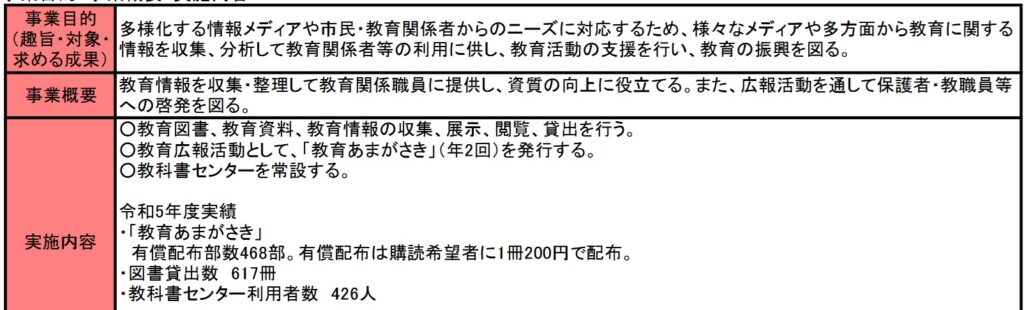 とありますが、実施内容は教育関連書籍の購入と雑誌「教育あまがさき」の作成です。