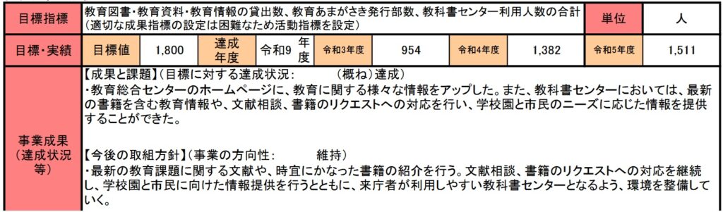 事業の目標指標でやはり、書籍貸出数や教育センター利用者数を指標にしていました。