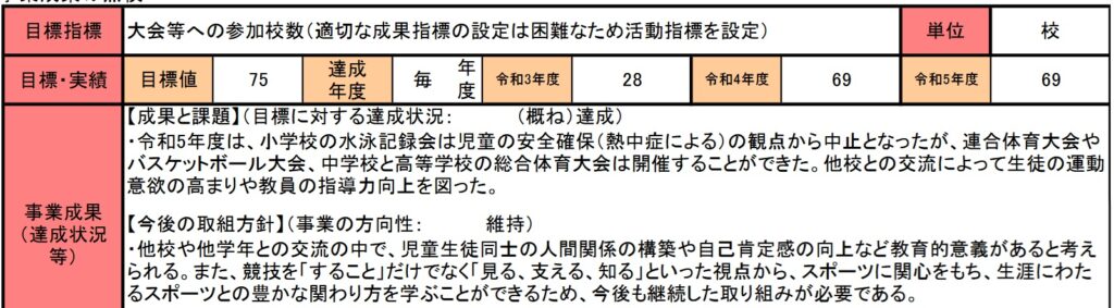 効果がないと証明されたこの事業ですが、ただ参加校が目標指標より少なかったとして、事業継続するとあります。参加校が増えたり、大会参加選手が増えたからと言って、尼崎市内の児童生徒全体の体力・運動能力向上には効果がないことは想像できます。